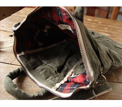 参考了军队的头盔包的设计,把包的尺寸略為缩小,就成了这款迷你单肩斜跨布包。虽然放不进头盔,但对于日常生活使用,这款迷你斜跨包的大小却是卓卓有餘的。