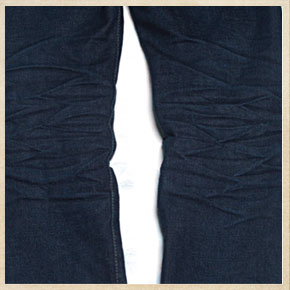 | 水磨感,板纹,下摆部位的皱纹很明显,仔细一看皱纹部位稍有掉色。 大腿,膝盖部位的面料也有在掉色。 |