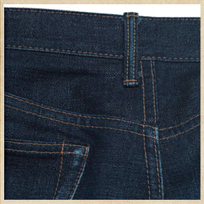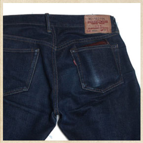 | 腰带部位和后口袋部位有明显的掉色。后腰三角部位经常和地面摩擦,所以开始掉色了。 | 皮革标签第一次洗有缩小,但是现在不明显了。因为使用天然的皮革,所以好像皱纹稍微复原了。 |