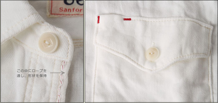 2、着用時に第一ボタンを外しても襟元が美しく見えるように、前端にロープを通しています。デザインアクセントの、ポケット部分の