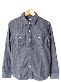 表がデニム(綾織り)、裏がシャンブレー(平織り)の二重ガーゼ生地をUESで企画しました。この織り組織は、生地にする上で高度な技術が必要なため、ベーシックに見えても他では目にすることがない、UESオリジナルの生地です。糸に強いテンションをかけない力織機で織ることで、二重ガーゼ独特の柔らかさ、ふっくら感をより強調することができました。