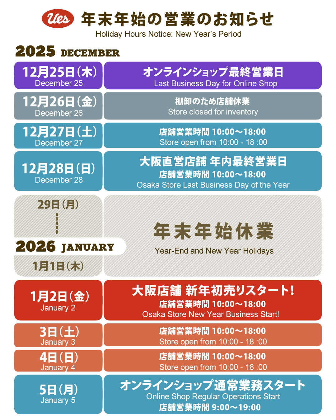 The last business day of the Osaka UES store is Sunday, December 28th.